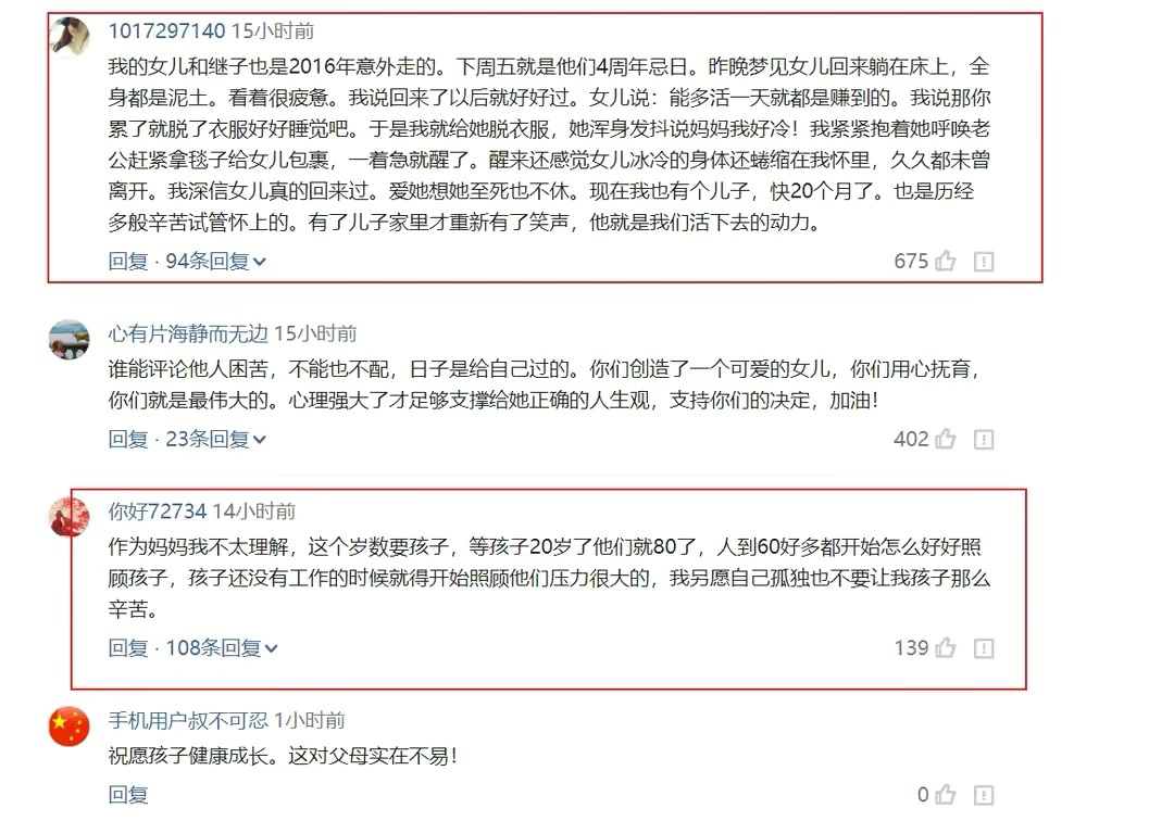 也有同样失独的母亲分享相似的经历:“我的女儿和继女也是2016年意外走的……现在我也有个儿子,快20月了。也是历经多般辛苦试管怀上的。有了儿子家里才重新有了笑声,他就是我们活下去的动力。”