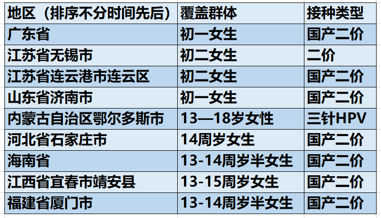 部分HPV疫苗免费接种地区公开信息摘录据报道整理