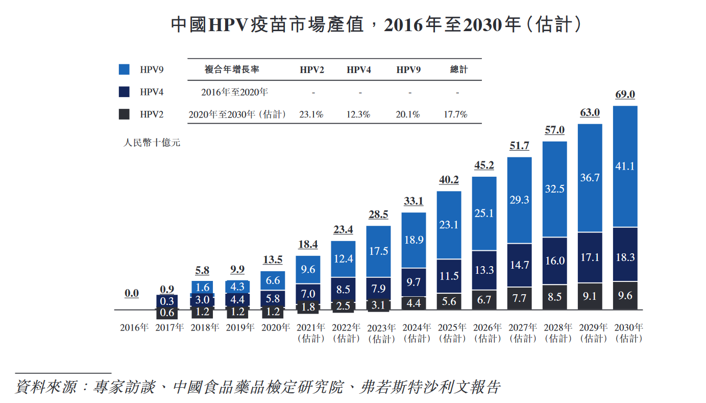 数据显示,中国首款HPV疫苗于2017年获批。此后,HPV疫苗的市场规模在2020年增至人民币135亿元,预计到2030年将达到人民币690亿元,十年复合年增长率为17.7%。