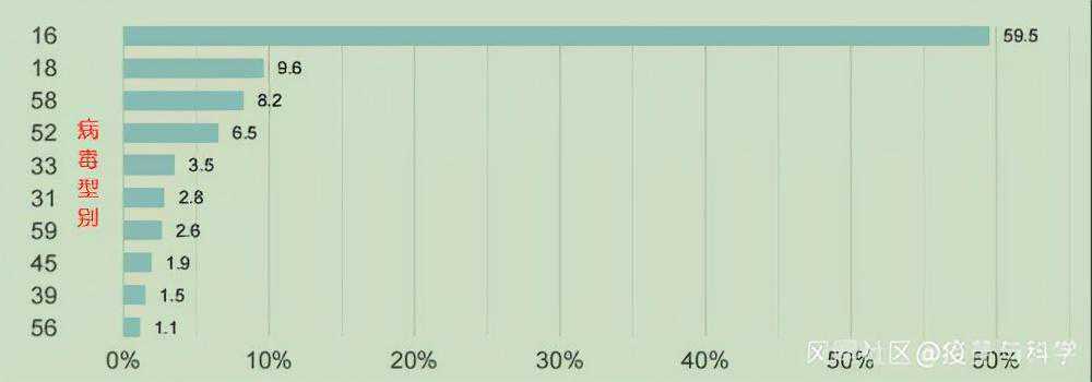 该报告的图60,展示了中国各型别HPV病毒在宫颈癌组织、低危病变组织、高危病变组织和正常组织中的占比,其中16和18型是在宫颈癌组织里占比最多的,分别为59.5%和9.6%,合计69%。这些构成比数据,更新到2015年6月。