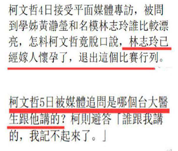1个月后,9月4日,台北市长柯文哲接受媒体专访时,不慎走漏风声,脱口而出:林志玲已经嫁人怀孕了。堂堂一个市长,又是曾经的台大医院外科教授,应该是能收到些内幕消息,不会说谎的。