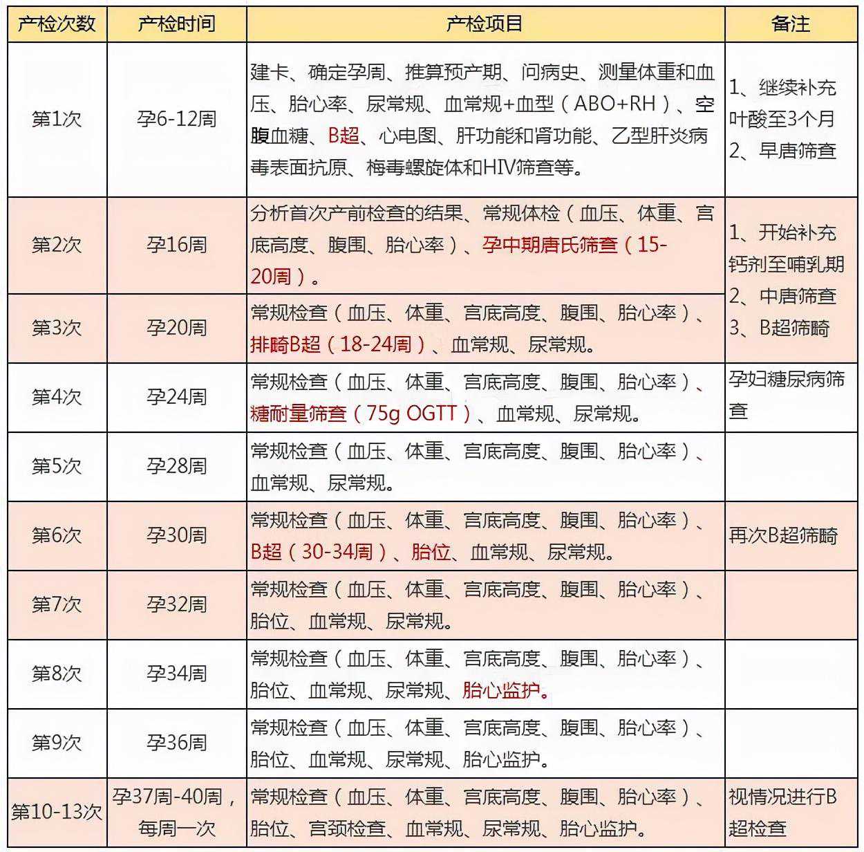 01、孕期13次产检项目和时间,准妈妈们最好先收藏第一次产检最佳产检时间是怀孕6到12周,这时候的产检项目较多,包括建卡、确定孕周、推算预产期等内容。这次产检中,孕妇会被要求照B超,同时也会进行一些病毒筛查。