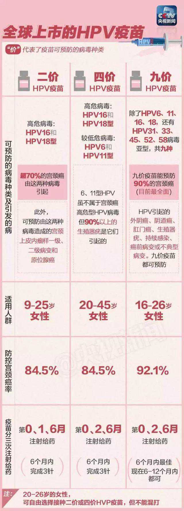 目前获准进入中国的疫苗,二价疫苗的推荐接种年龄为9~25岁,四价疫苗的推荐接种年龄是20~45岁,此次批准上市九价HPV疫苗适用于16到26岁的女性。