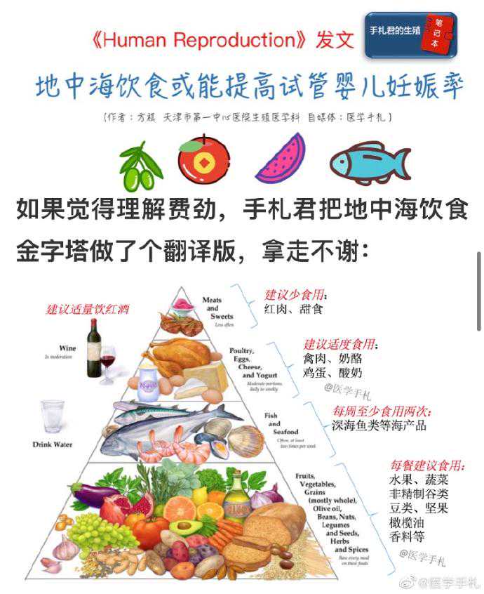 如果非要提饮食和备孕,那咱们就参考下高质量的文献吧。HumanReproduction上一篇关于地中海饮食模式或能提高试管婴儿妊娠率的文献相对质量较高,手札君把它分享出来,为了方便大家阅读,其中英文部分的地中海饮食金字塔手札君已经为大家翻译好了。