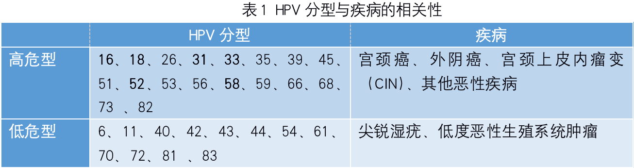 首先,HPV有许多亚型,按照其与疾病的相关性,分为高危型和低危型(见表1)。高危型主要引起生殖道肿瘤,包括宫颈癌、外阴癌和宫颈上皮内瘤变(CIN)及其他部位的恶性疾病等,主要包括HPV16、18、26、31、33、35、39、45、51、52、53、56、58、59、66、68、73和82等;低危型主要引起外生殖器和皮肤的尖锐湿疣,以及低度恶性的生殖系统肿瘤,主要包括HPV6、11、40、42、43、44、54、61、70、72、81和83等。而我国最常见的高危型为HPV16、18、31、33、52和58。