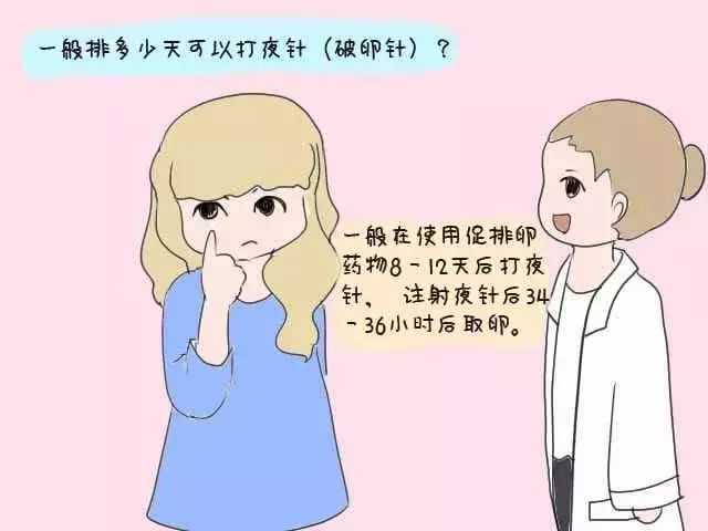 医生会结合患者的卵泡大小和雌激素水平来确定注射日。注射夜针后一般34-38小时后会安排取卵手术。取卵手术在上午8:00-10:00之间是最为适宜的时间。因此“扳机”的时间一般会给大家安排在晚上8:00以后,也就称之为“夜针”。
