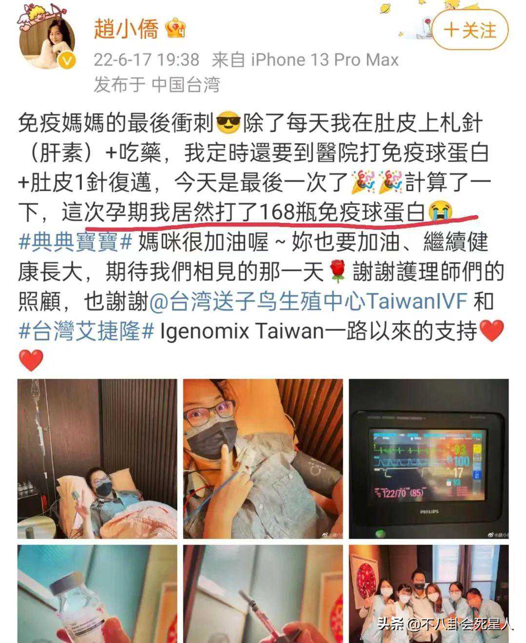 说起来,赵小侨的怀孕经历可谓是一波三折,这已经是她的第四次试管婴儿了。而且,赵小侨在孕期期间,共打了168瓶免疫球蛋白,真是很令人震惊。