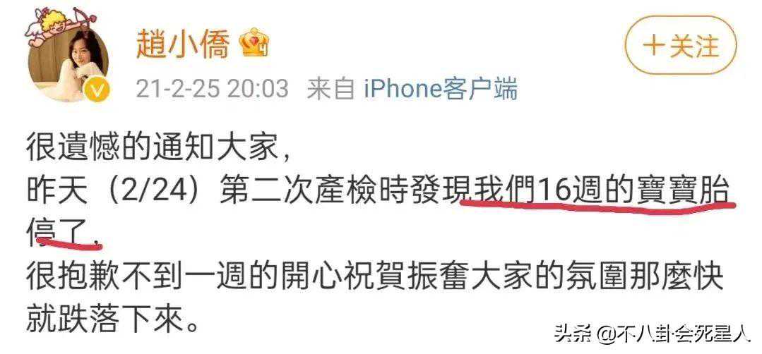 实际上,在经历了两次试管失败后,赵小侨都没有放弃,第三次试管好不容易成功了,却在怀孕16周的时候,意外发生了,宝宝胎停了,这对求子心切的赵小侨来说无疑是沉重的打击。