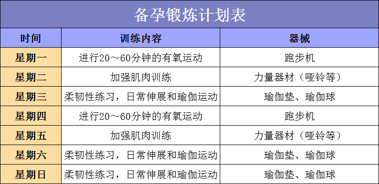 适当运动——提高身体素质锻炼身体,有助于提高妊娠的几率。我利用闲暇时光,给自己制定了一份备孕锻炼计划表,让我的备孕计划在有条不紊的进行。由于之前的运动基础,我个人认为我还是属于比较爱运动的。